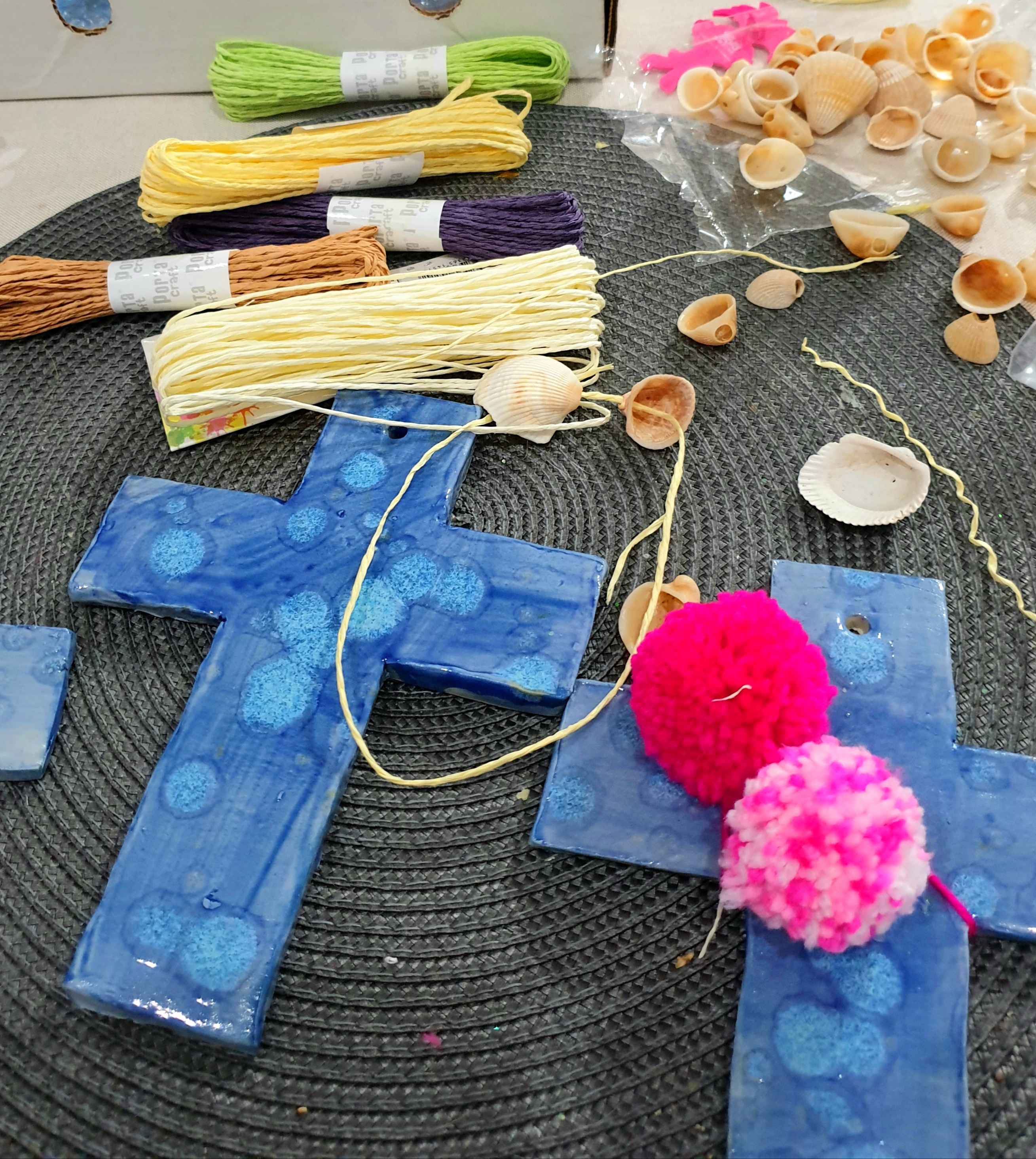 Embellishing with hand picked shells from pallarenda beach and and hand made wool pom poms