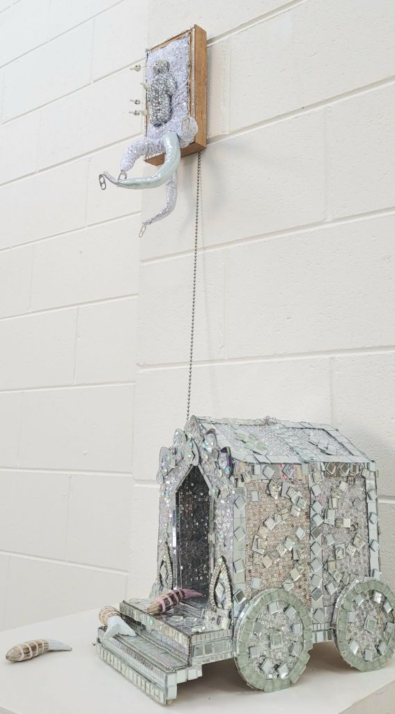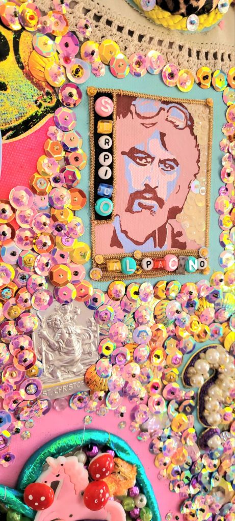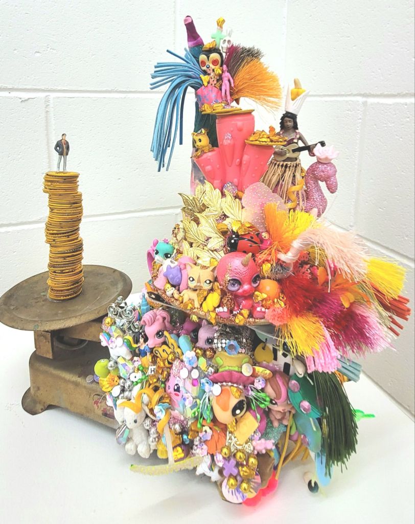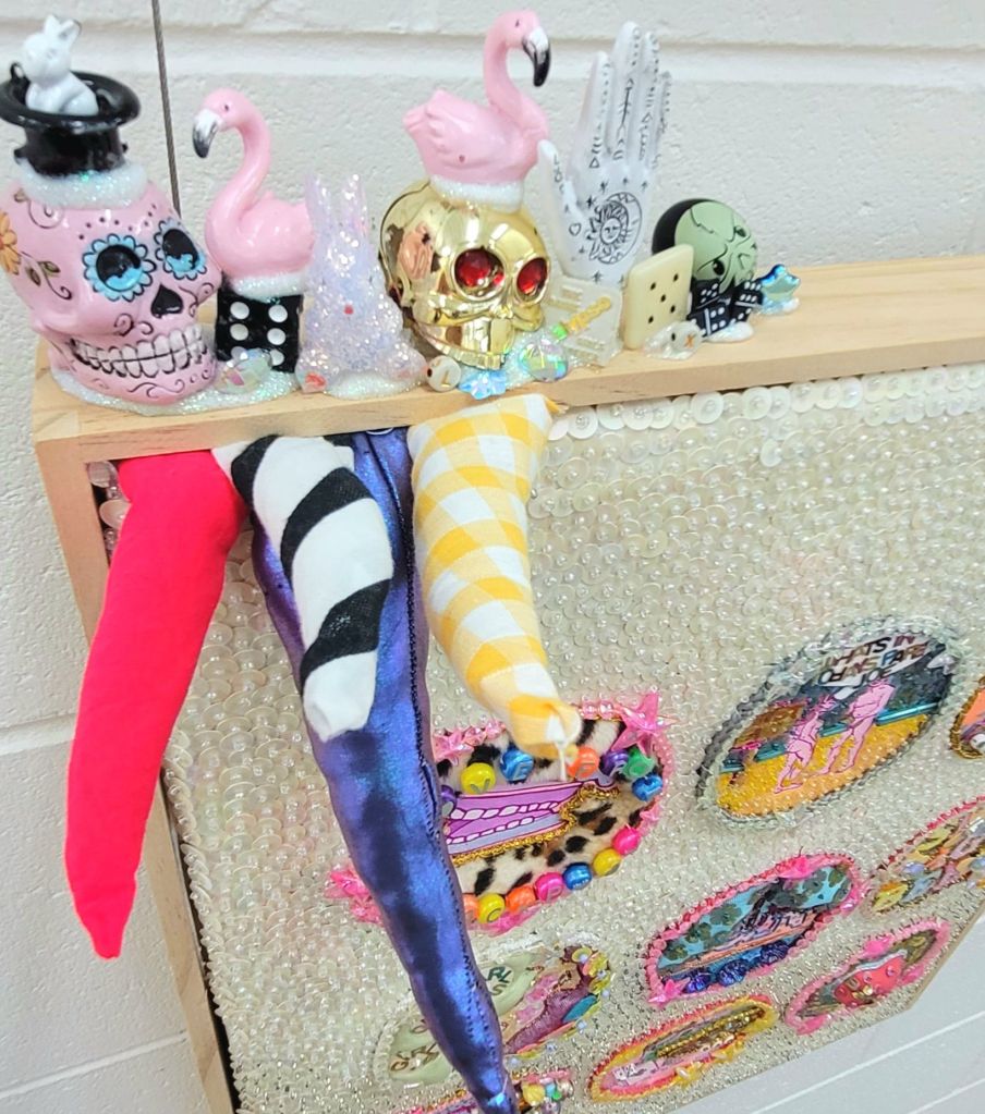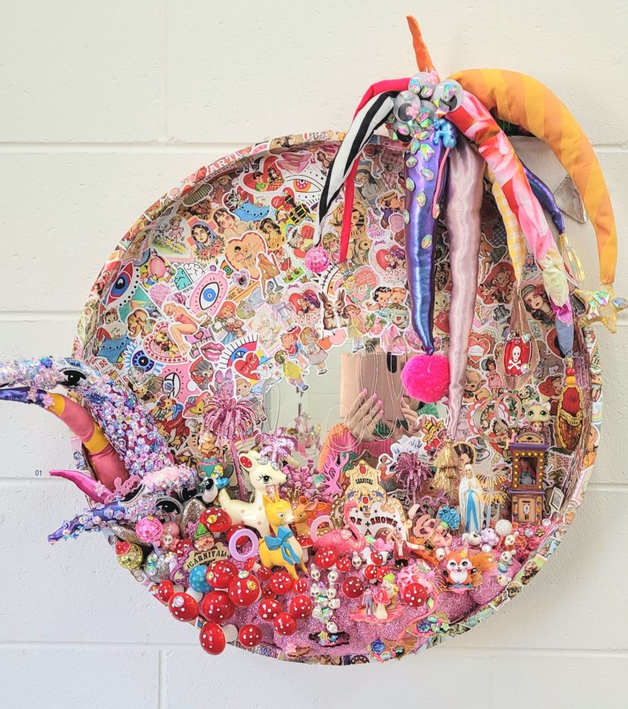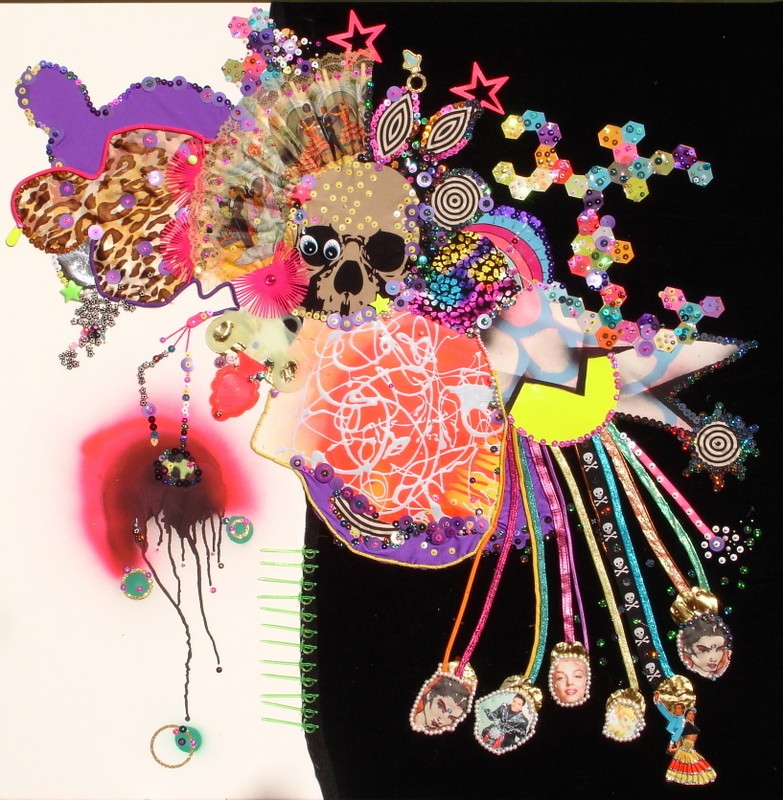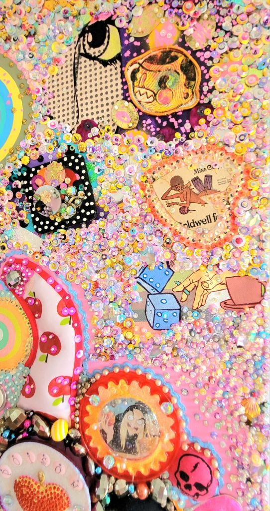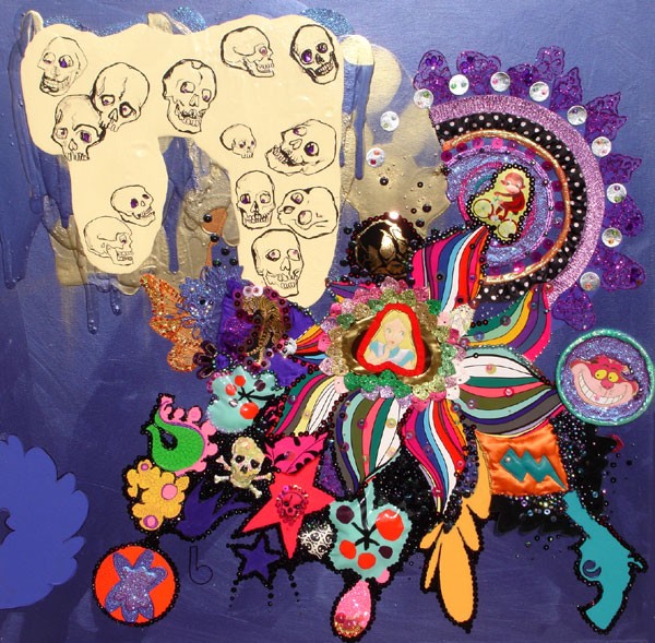 (Middle) What Size Do You Like it (Said Alice to the Hatter)? 2001-2024. Handstitched sequins with fibre, paint, plastic $500