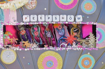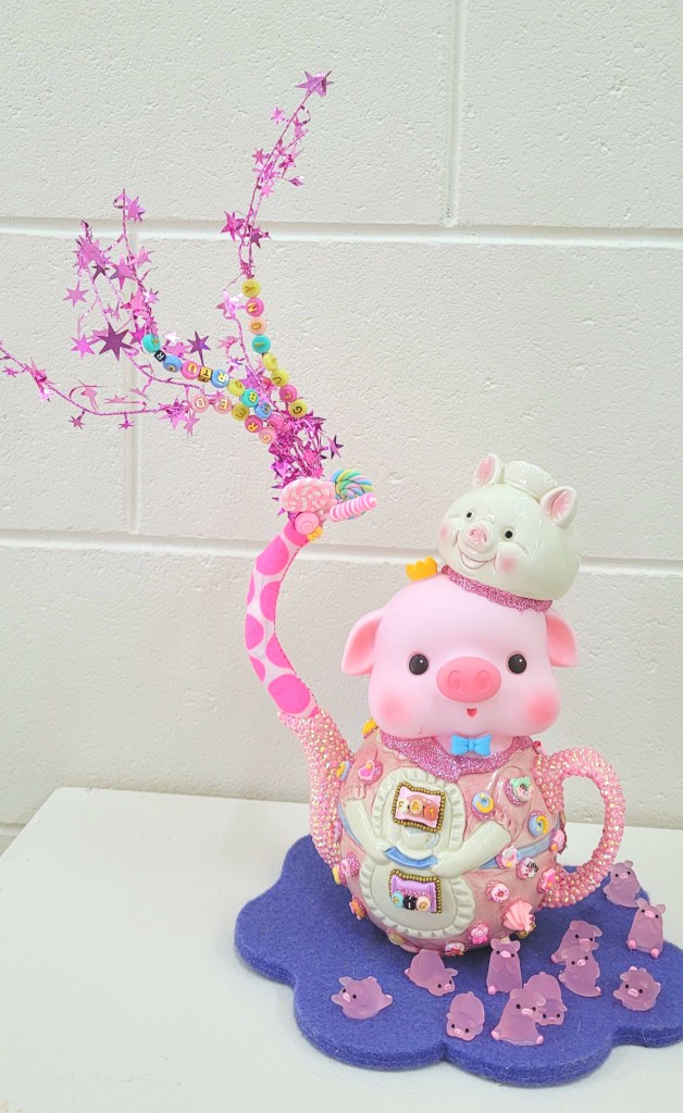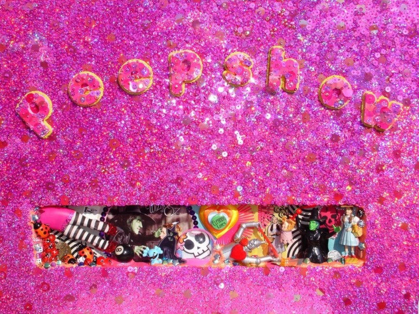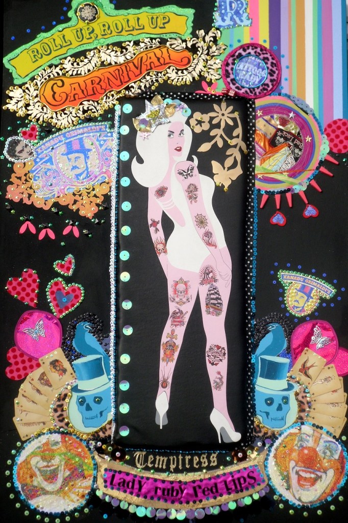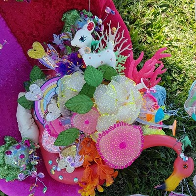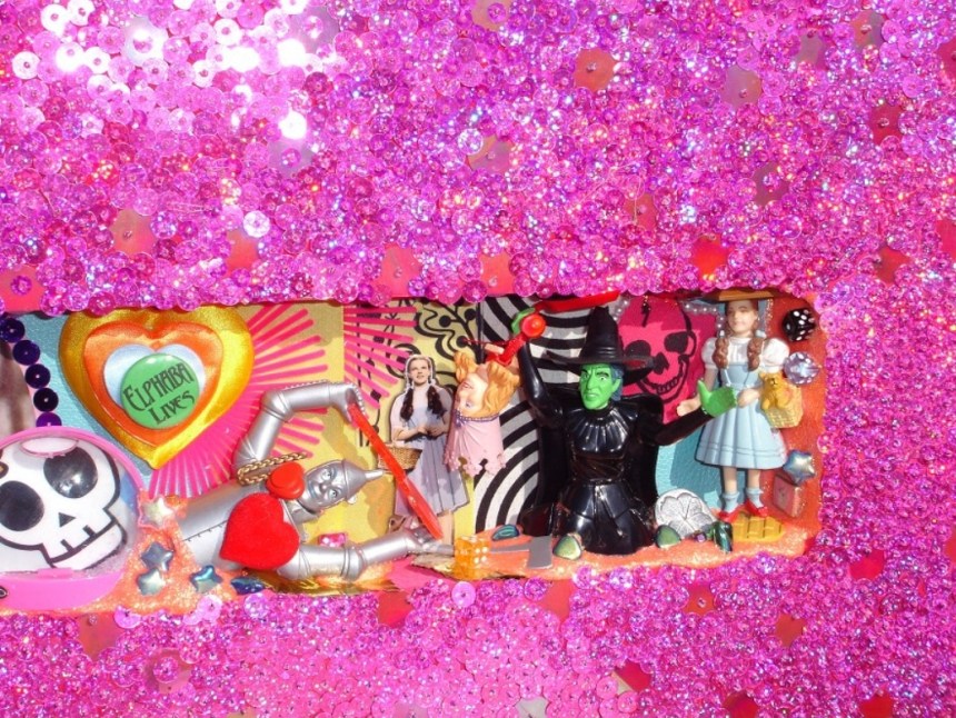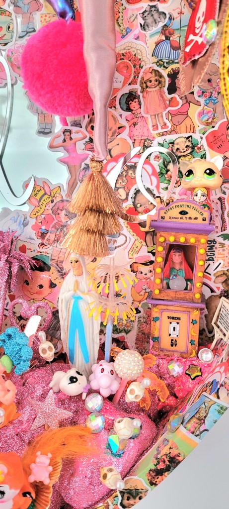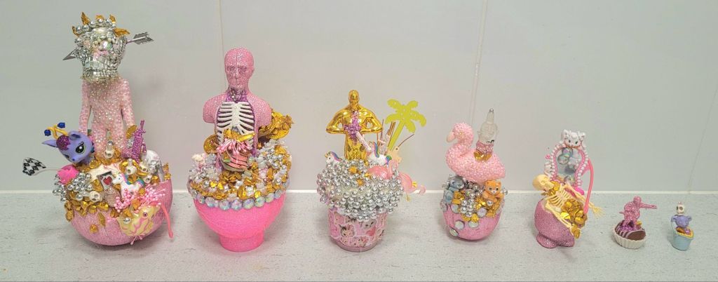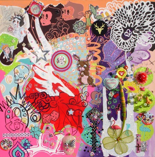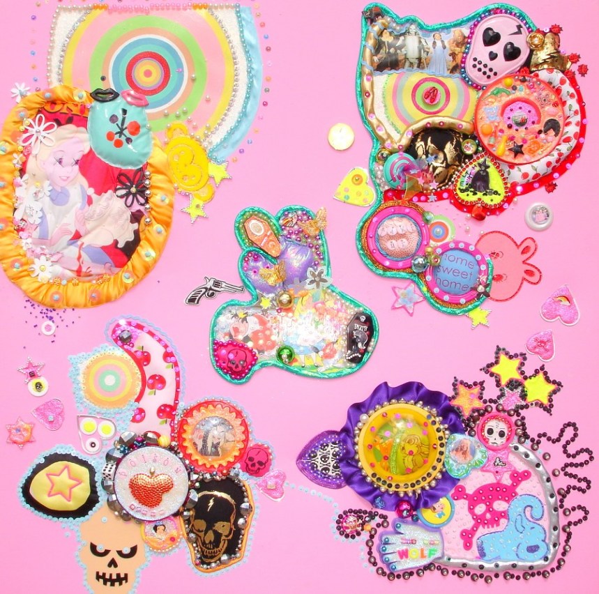 (Middle) What Size Do You Like it (Said Alice to the Hatter)? 2001-2024. Handstitched sequins with fibre, paint, plastic $500