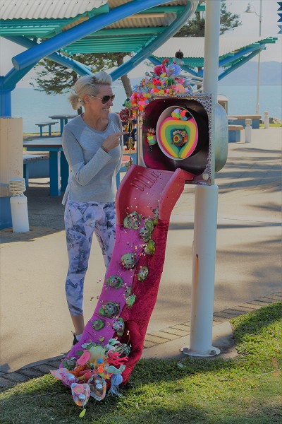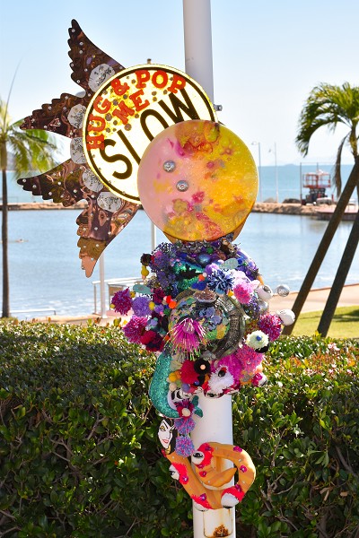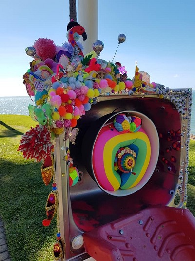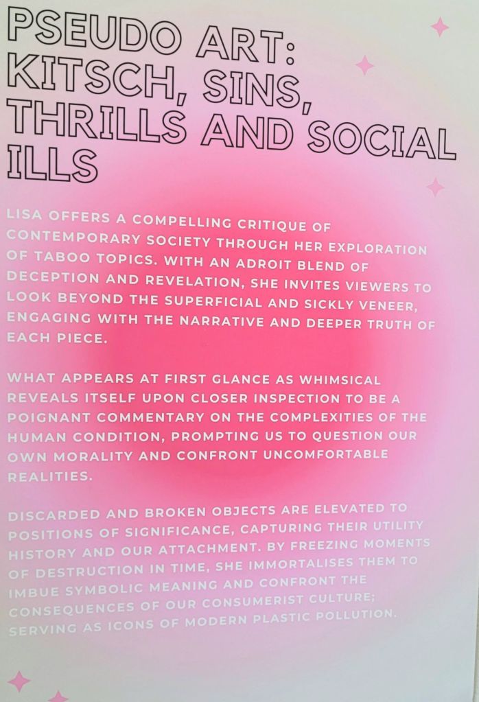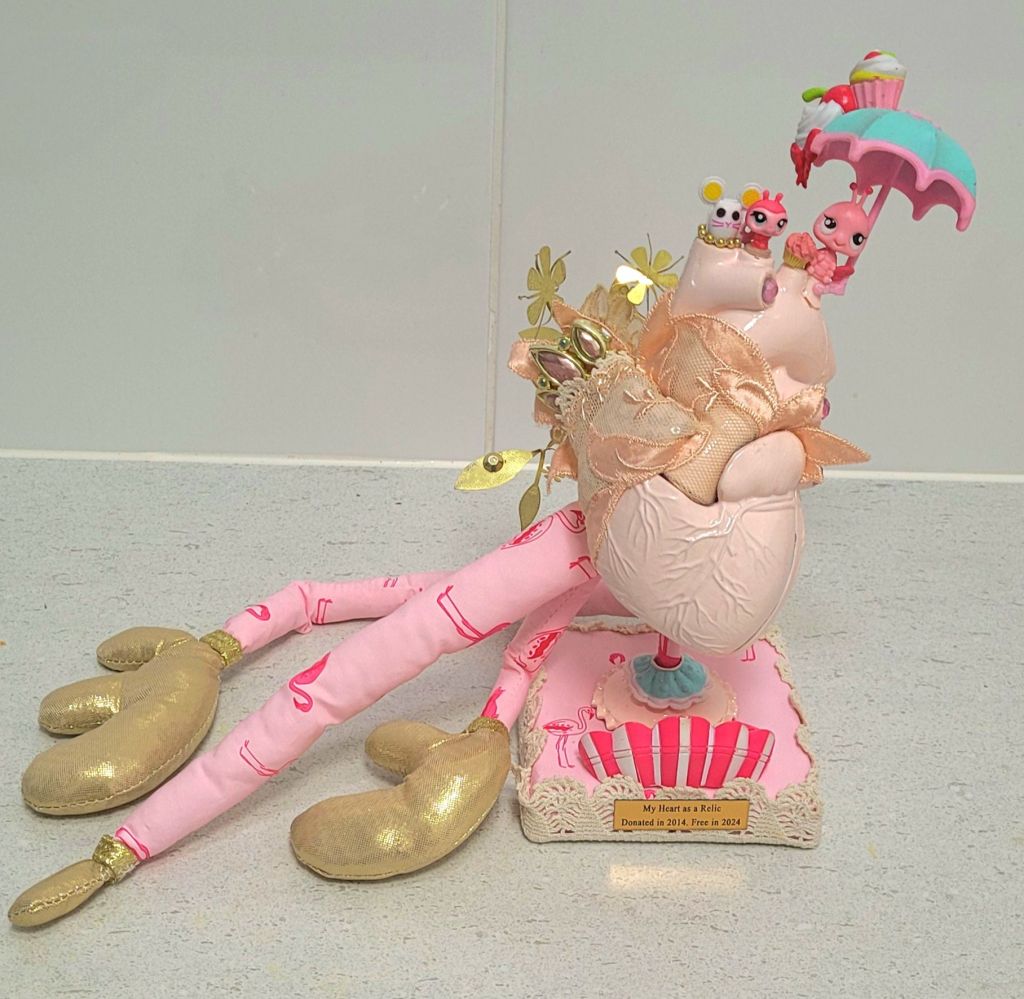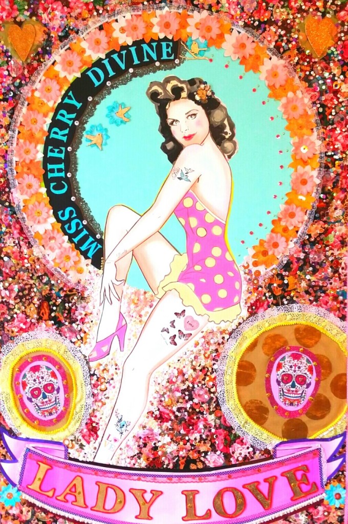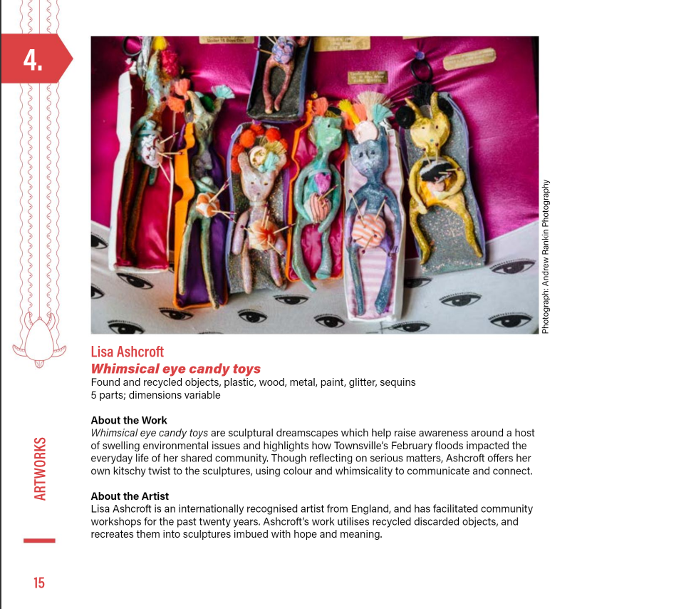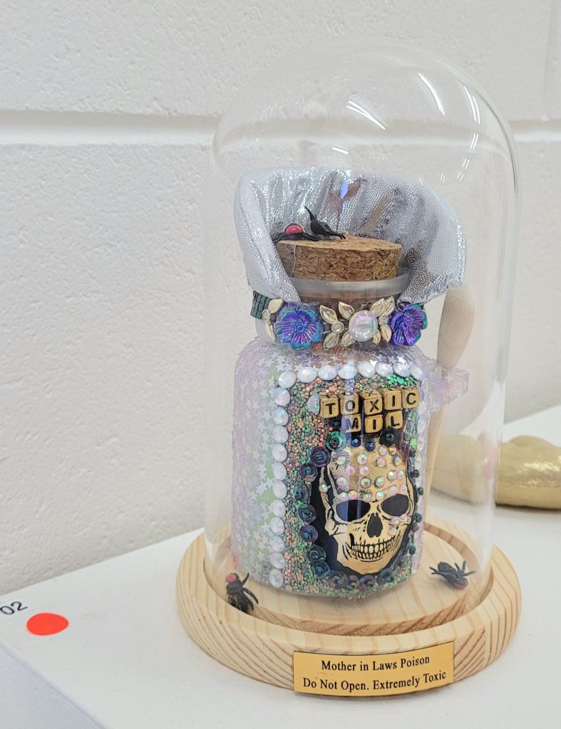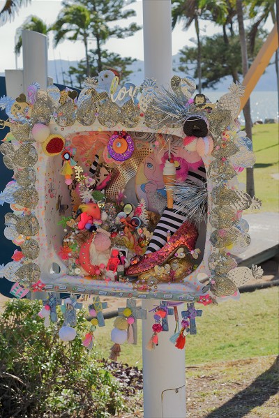 (Middle) What Size Do You Like it (Said Alice to the Hatter)? 2001-2024. Handstitched sequins with fibre, paint, plastic $500