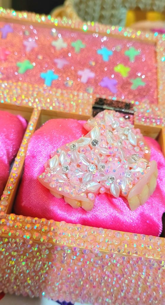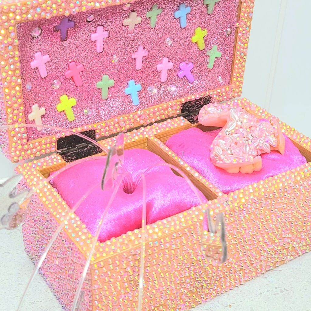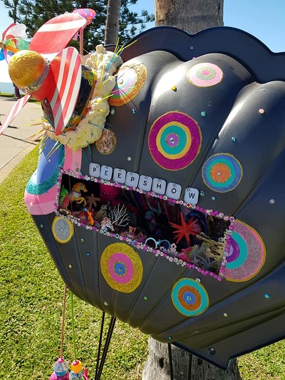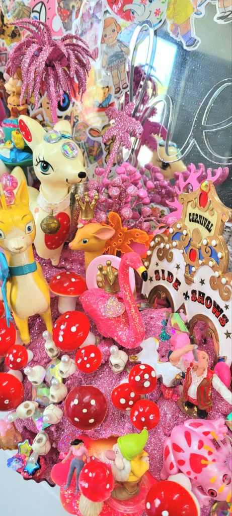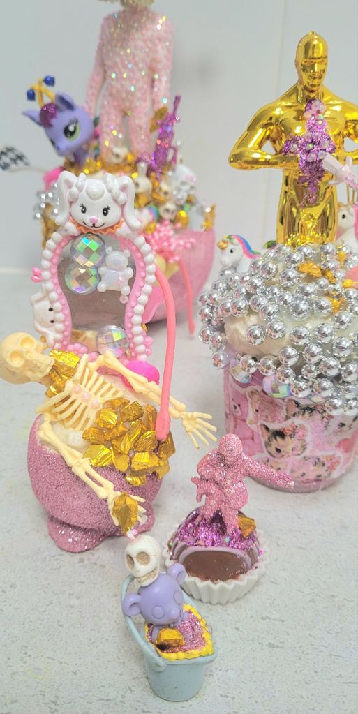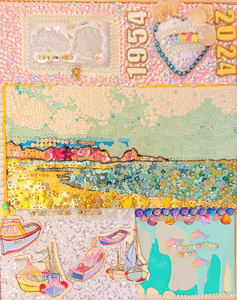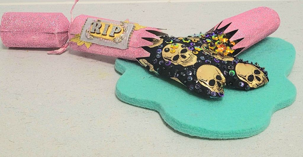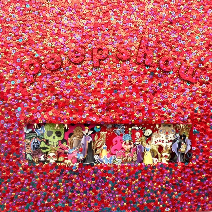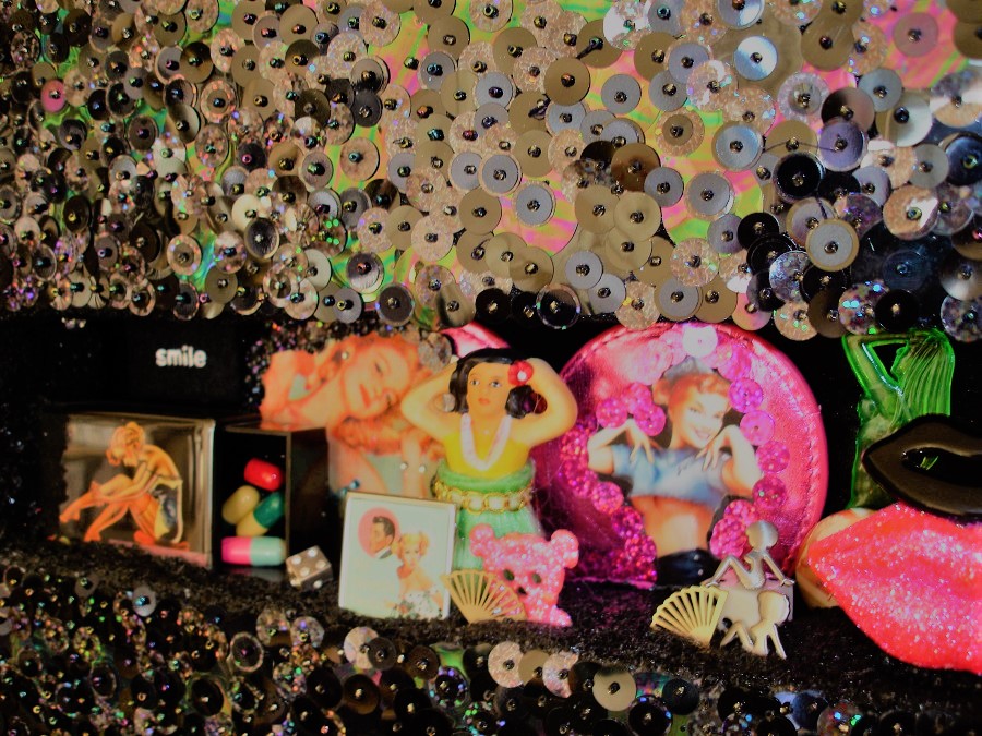(Top) Don’t be Shy (Said Grumpy to Bashful) 2001-2024. Handstitched sequins with fibre, paint, plastic $500