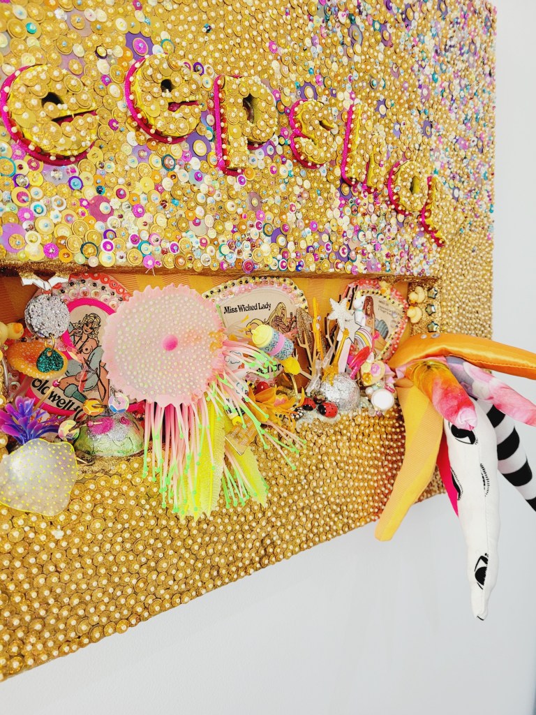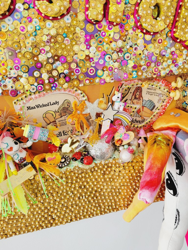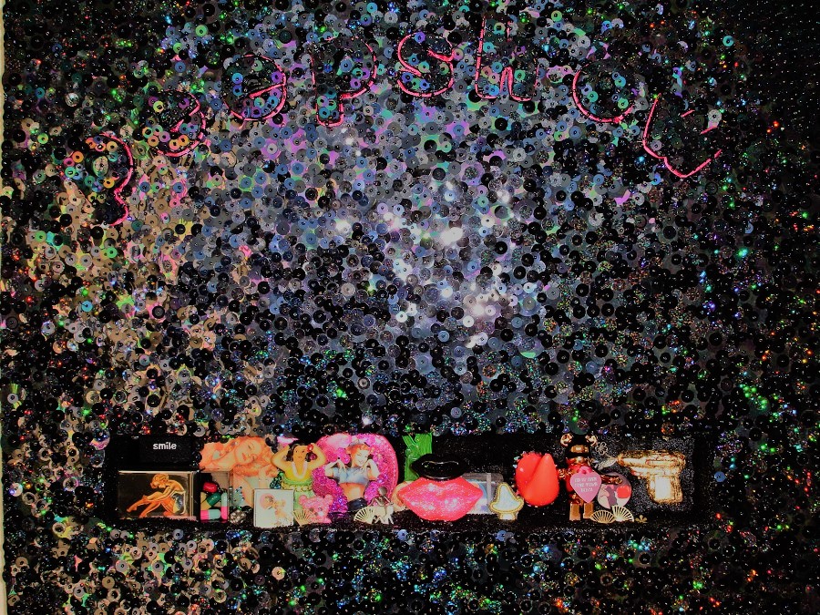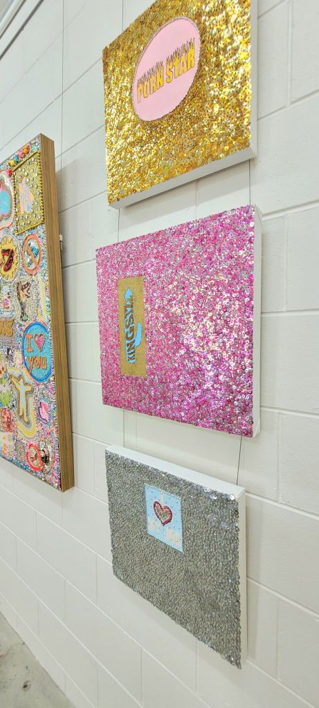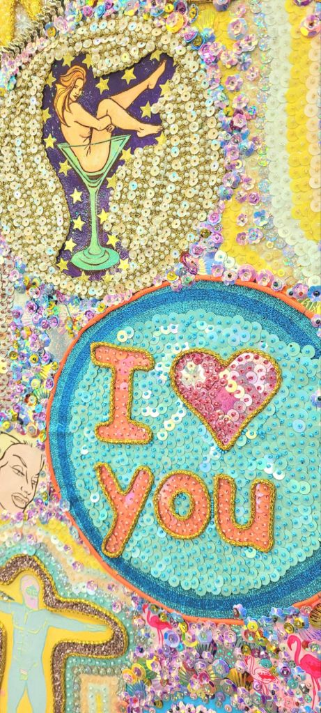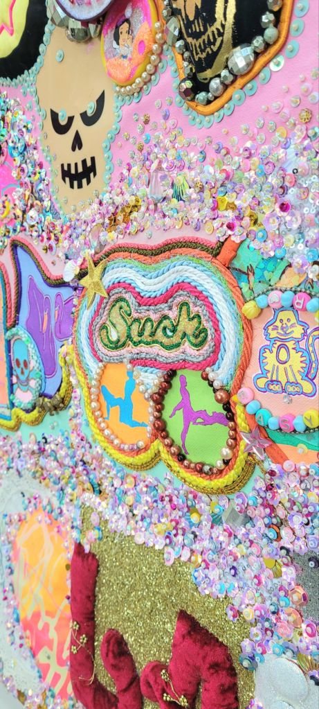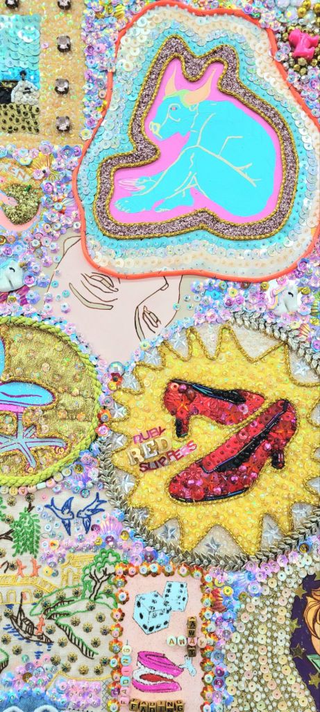 (Bottom) Do You Like My Job (Said the Tired and Old Sex Worker)? 2001-2024. Handstitched sequins with fibre, paint, plastic $500