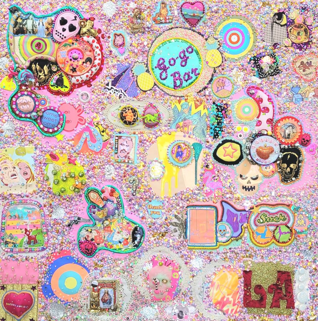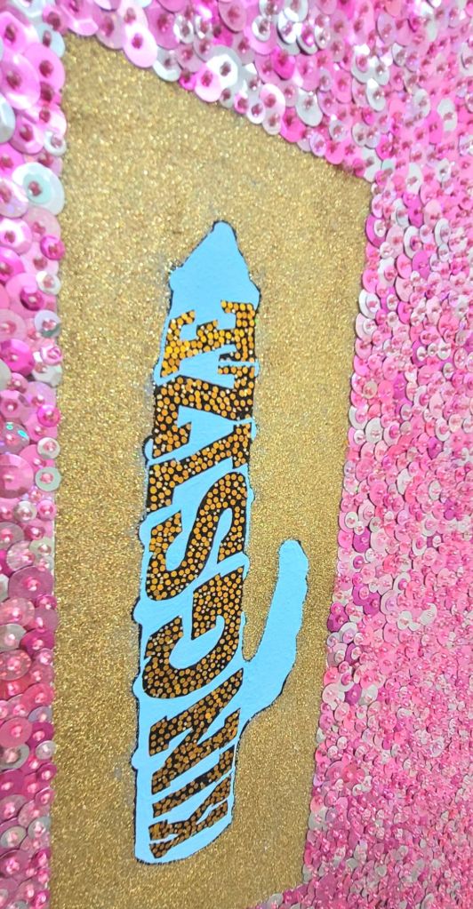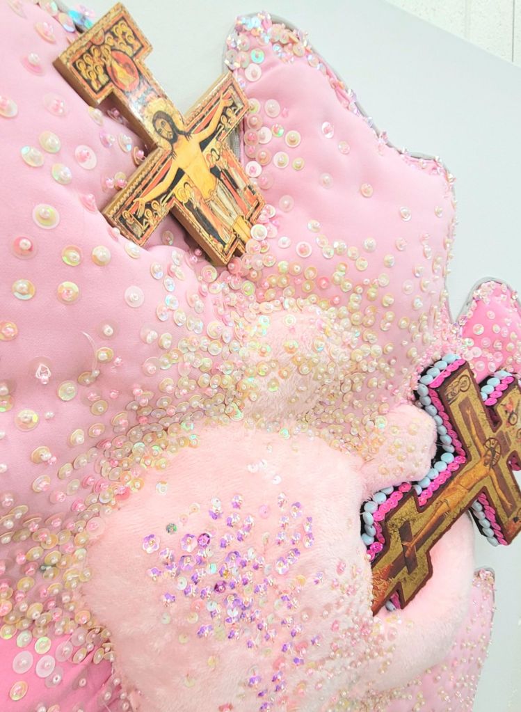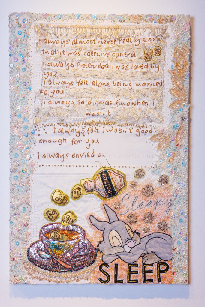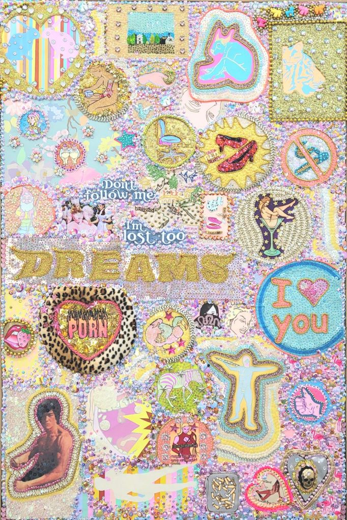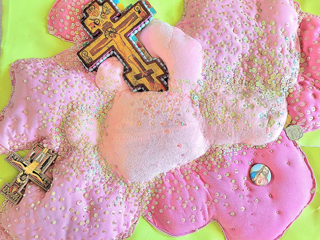 (Bottom) Do You Like My Job (Said the Tired and Old Sex Worker)? 2001-2024. Handstitched sequins with fibre, paint, plastic $500