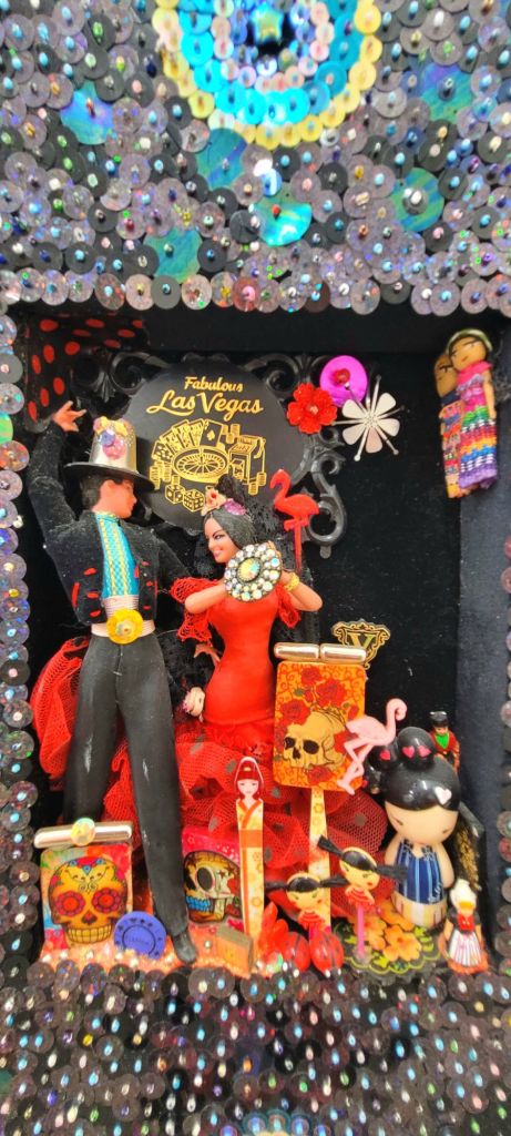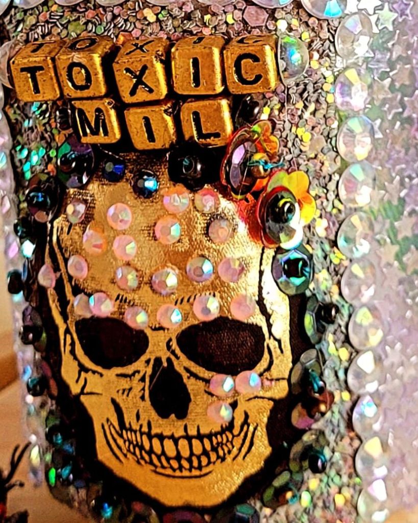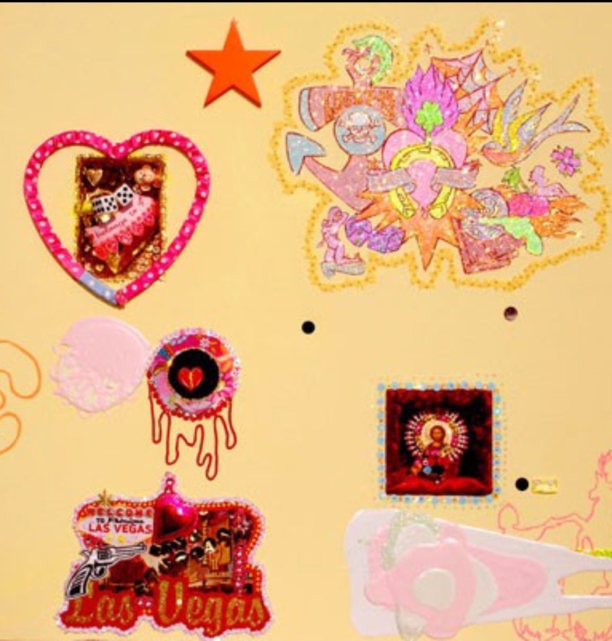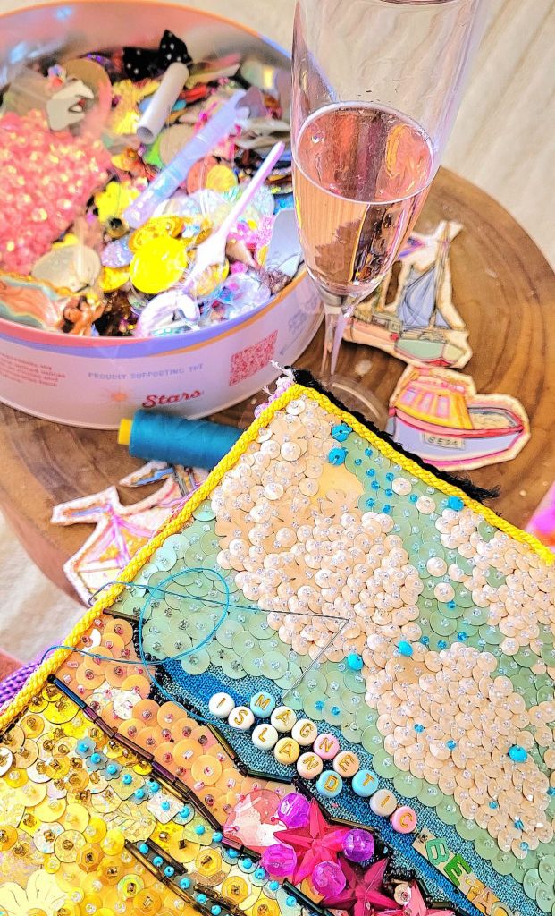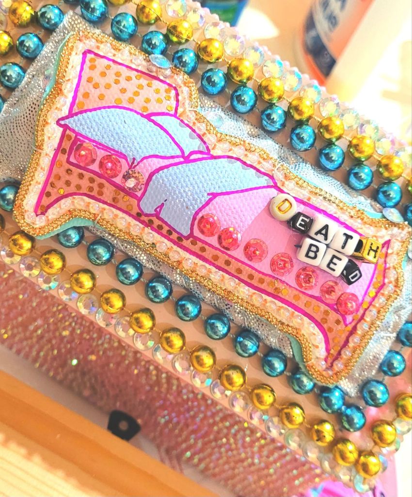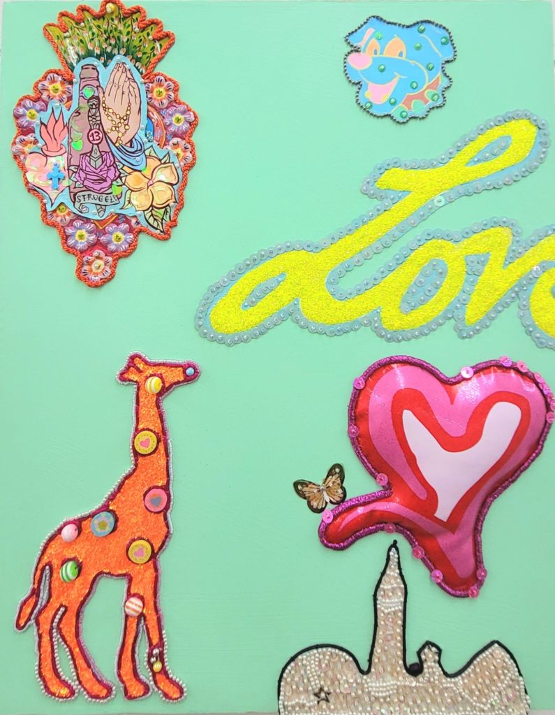 (Bottom) Do You Like My Job (Said the Tired and Old Sex Worker)? 2001-2024. Handstitched sequins with fibre, paint, plastic $500