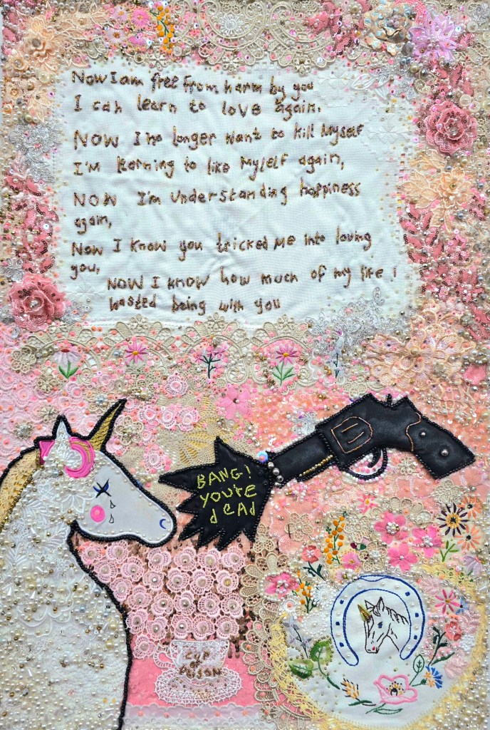 Title: I Always Almost never Really Knew. Handstitched on canvas.